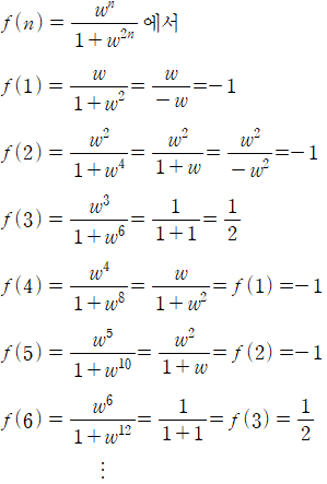 $f \left(n \right)= \frac{w^{n}}{ 1+ w^{2n}}$