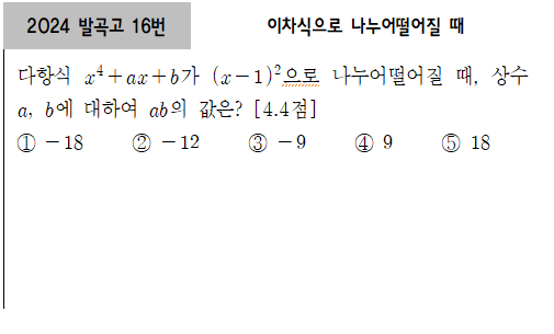 | [공통수학1] 2024 광동고1_ 9번 [나머지정리] (0) | 2025.04.19 |