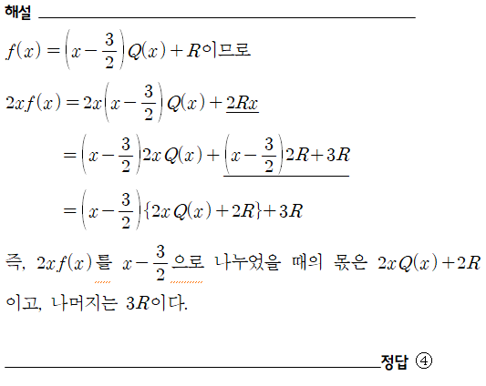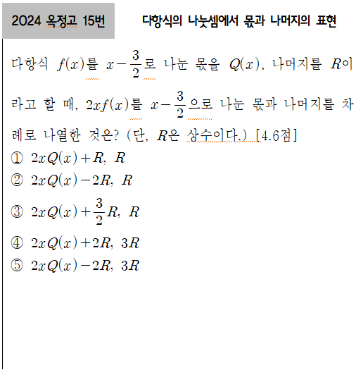 | [공통수학1] 2024 발곡고 8번 [다항식의 나눗셈에서 몫과 나머지의 표현] (0) | 2025.04.18 |