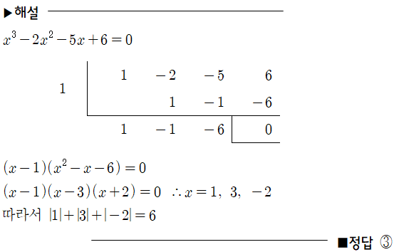 직접 세 근을 구하면 되는데, 절댓값이라서 당황함. 근과 계수의 관계로 접근하려다 정답을 못 구했음.