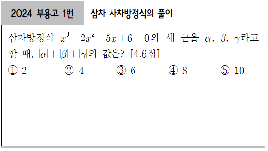| [2024학년도 송양고1] 1학기 2차 지필평가 9번_ 삼차방정식의 한 근을 알 때 다른 근 구하기 (0) | 2025.05.08 |