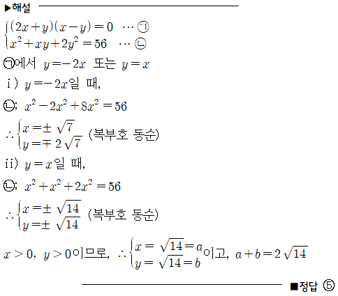 연립방정식 $\begin{cases} (2x+y)(x-y)=0 \\ x^2 +xy +2y^2 =56 \end{cases}$의 해 중 $x>0$, $y>0$을 만족시키는 해를 $x=a$, $y=b$라 할 때, $a=b$의 값은? [4.5점]