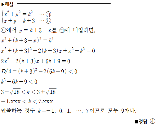 연립방정식 $\begin{cases} x^2 +y^2 = k^2 \\ x+y=k+3 \end{cases}$가 실수해를 갖지 않기 위한 정수 $k$의 개수를 구하면? [5.2점]